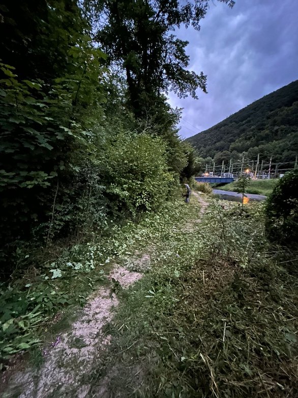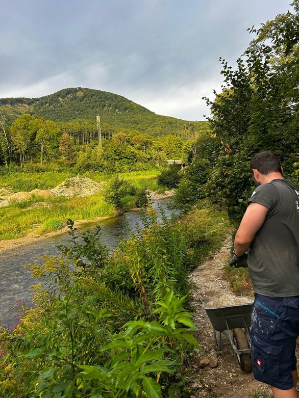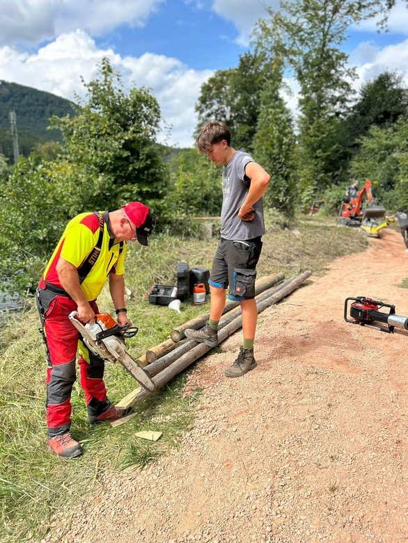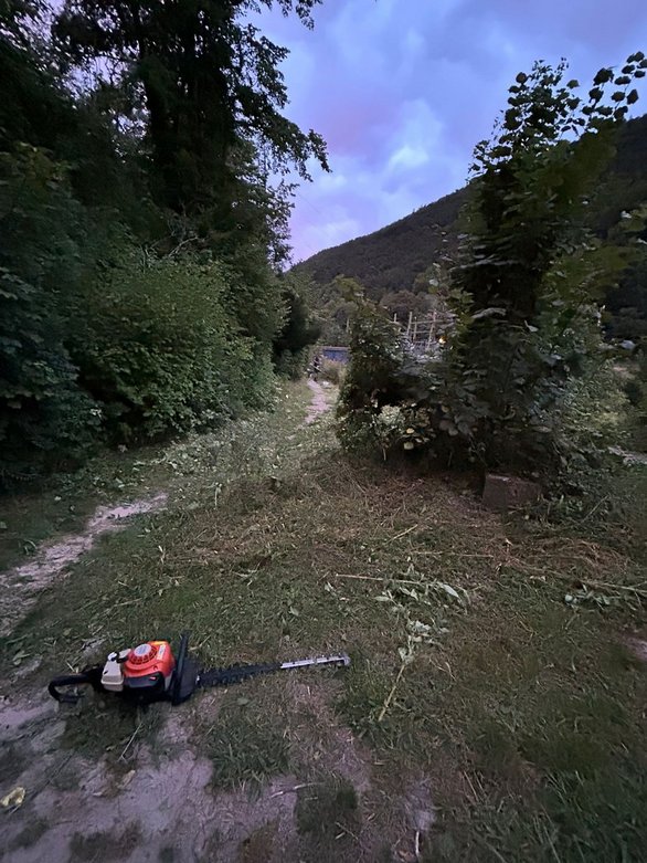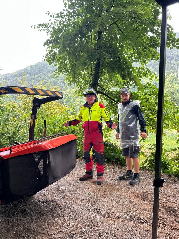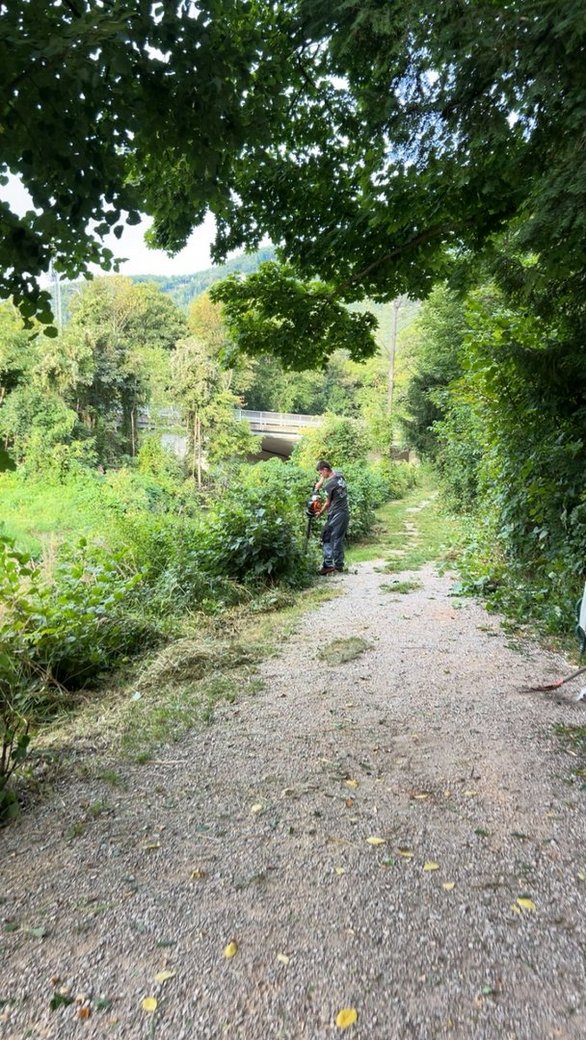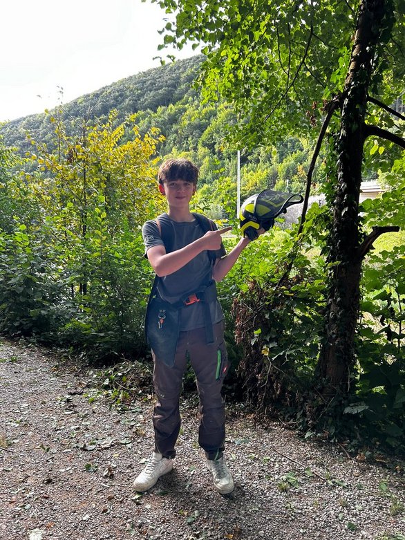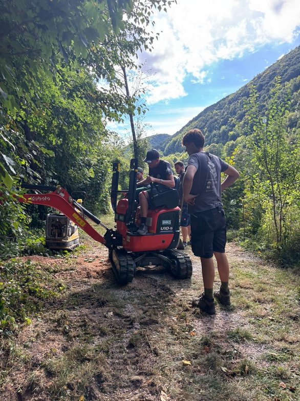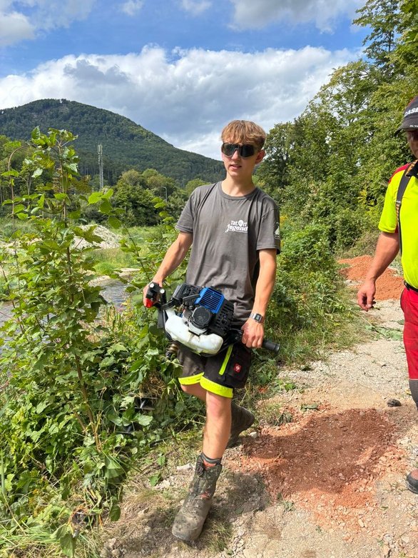 Wir sind um 6:00Uhr in den Tag gestartet und bereits fleißig am arbeiten! Dank der gestrigen Vorarbeiten können wir heute viel erledigen: das Geländer wird montiert, der Weg wieder begehbar gemacht und weiter ausgemäht. Arbeitssicherheit wird bei uns natürlich großgeschrieben, wie uns Berni demonstriert, aber auch die Motivation bleibt nicht aus!☺️
