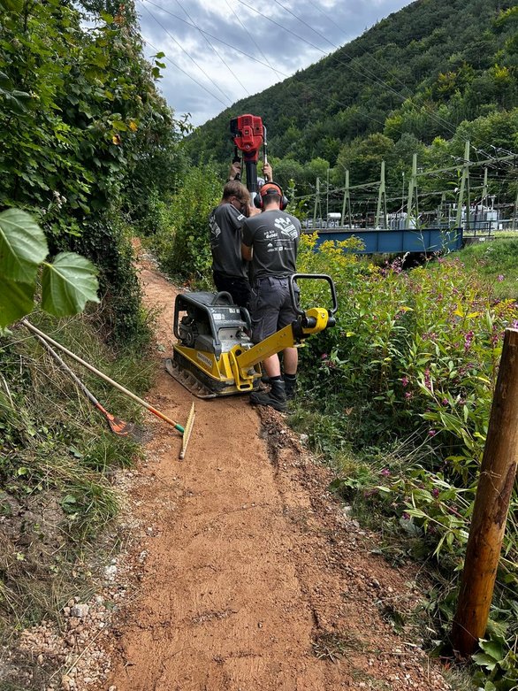Mit dabei wäre unser Armin, Berni, Tobias, Lorenz, Michi, Dominik, Daniel und Andreas. Mit kleinen Schwierigkeiten zwischendurch aber voller Motivation und deren handwerklichen Geschick sind sie gerade dabei, das Geländer zu montieren und den Weg neu aufzuschütten.