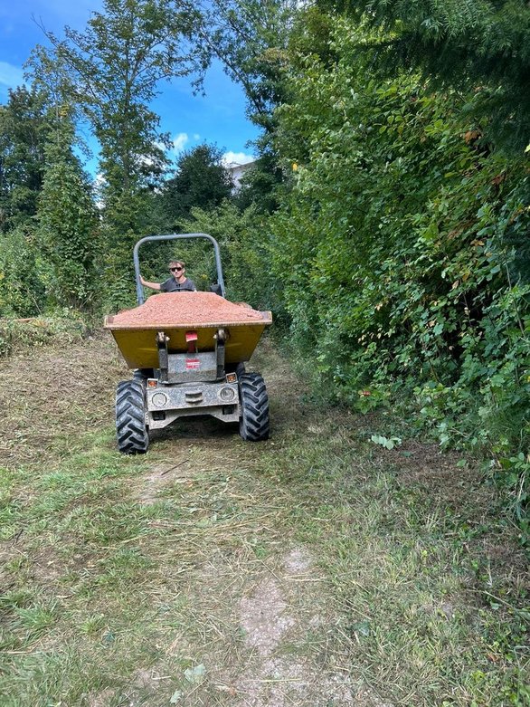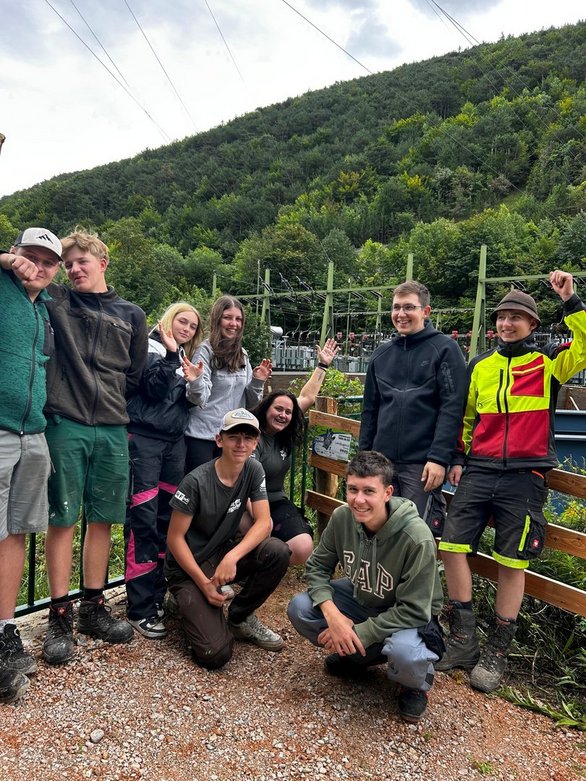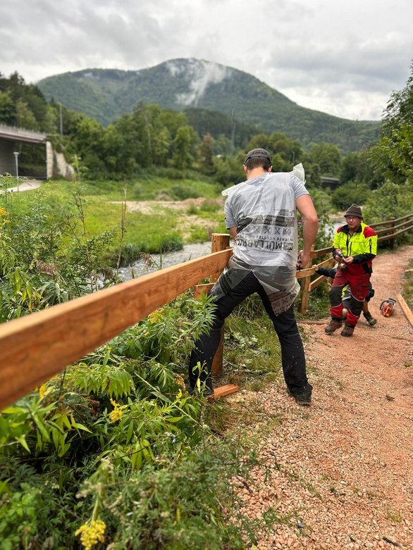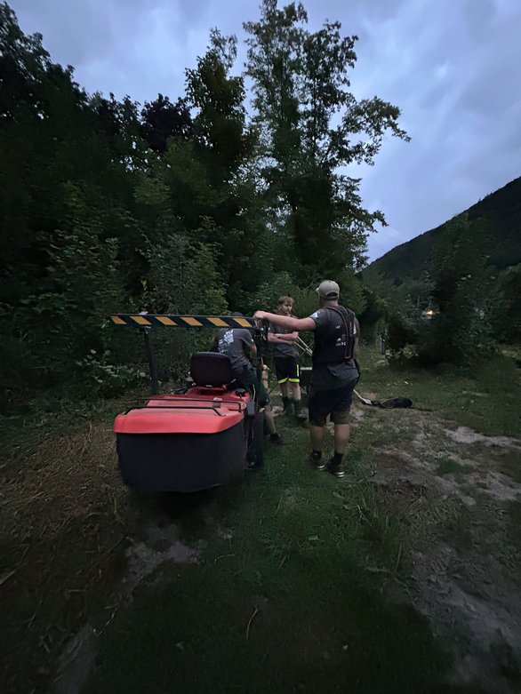 Unsere Burschen arbeiten in vollem Gange, mit der kleinen Mulde wird auf und ab gefahren. Die letzten Ausmäharbeiten konnten auch noch vor dem Regen erledigt werden. Leider spielte uns das Wetter nicht so ganz mit, aber mit der richtigen Besprechung und Adjustierung arbeiten wir trotzdem auf Hochtouren weiter. Das Geländer nimmt form an und wird heute Abend fertiggestellt. Die Motivation sinkt trotz des schlechten Wetters aber nicht. Wir sind froh, dass wir auf die Unterstützung vieler Helfer/innen bauen können, ohne die wären wir aufgeschmissen. Dieses Jahr können wir leider nicht bis in die Nacht arbeiten, da wir keine Möglichkeit haben, den Weg sorgfältig auszuleuchten. Der Spaß bleibt uns aber nicht weg und unsere Teamfähigkeit wird auch gestärkt!