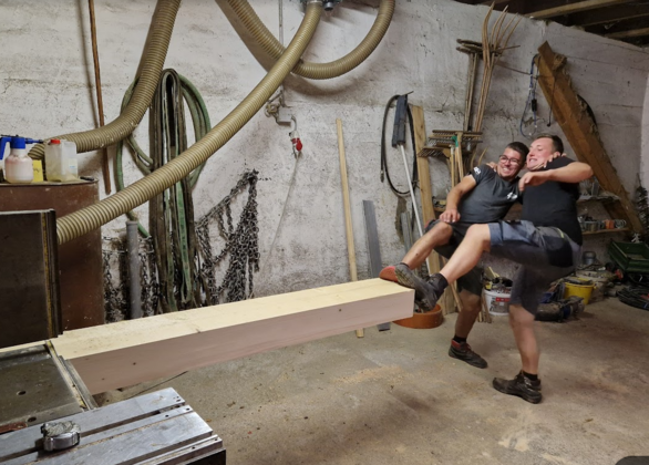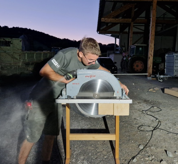 Nun bin ich neugierig geworden, was die andere Gruppe vor sich hat. Deshalb rolle ich direkt über die hügelige Landschaft der Buckligen Welt weiter nach Aigen. Dort angekommen sehe ich die aus der Puste gekommenen Helferleins, die nur mehr vor sich hin schwitzen. Aber kein Wunder, denn die Sparren, Pfetten sowie Säulen sind bereits abgebunden und das Holz geschliffen. Das Wort „abgebunden“ kommt mir anfangs Spanisch vor, doch ein Zimmermann erklärt mir, dass das ein Prozess ist, der das Anreißen, Zuschneiden und Kennzeichnen der Hölzer umfasst. So sind diese Teile dann leichter und vor allem schneller direkt beim Projekt zu montieren. Da die Mitglieder mir ansehen können, dass ich vom weiten Weg zu ihnen sichtlich müde geworden bin, darf ich am Traktor wieder mit nach Kirchschlag in die Bucklige Welt fahren. Hand aufs Herz: So eine Traktorfahrt ist schon was Tolles!