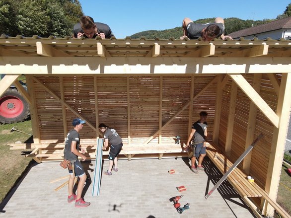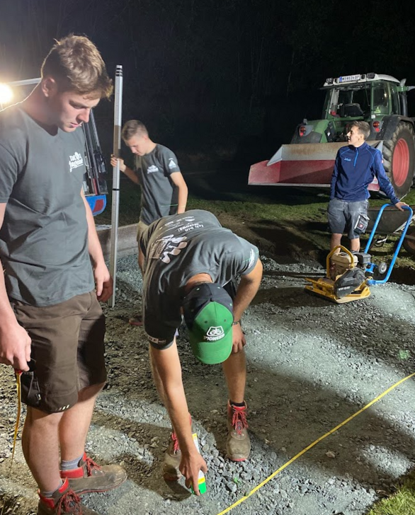 Während ich so vor mich hin fantasiere, beginnen die Landjugendmitglieder bereits mit der Aussteifung der Kopfbänder. Nebenbei fangen sie mit der Unterkonstruktion für die Fassade an. Doch was darf bei einem guten Projekt nicht fehlen? Genau – ein köstliches Mittagessen, welches sich die Mitglieder mehr als verdient haben. Nach dem Essen sind die Mitglieder wieder top motiviert und mit neuer Energie gestärkt, um das Projekt fortzusetzen. Eine Gruppe kümmert sich nun um den Unterbau fürs Pflastern, währenddessen sich die andere Gruppe der Einebnung des Volleyballplatzes widmet. So schnell kann ich gar nicht schauen, haben die Landjugendmitglieder schon die ersten Pflastersteine gelegt. Sie verblüffen mich wirklich jedes Mal aufs Neue."