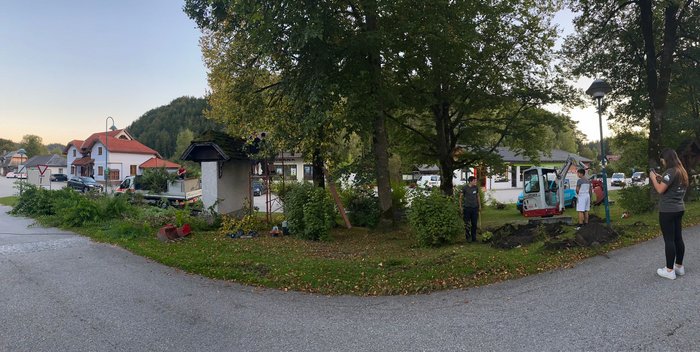 De Wasserleitung vom Brunnen im Park homs freigelegt – vielleicht a bissl zu frei, owa des wor ka Hindernis für de jungen Leid! De Kinettn san ausgehoben woan, damit donn de neichen Leitungen an Platz finden und des Hoppala is natürlich a glei ausgebessert woan!