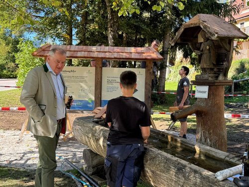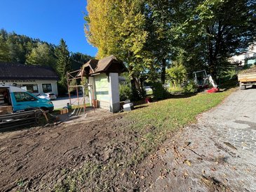 Oiso, wir hom bei unserm Brunnen so guad wie ois fertig. Rundherum is nu da Boden begradigt woan, dass ma moang donn scho in neuen Rasen säen kennan. A bei da großen Tafel is des Dach fertig deckt und der klane Platz davor is gereinigt.