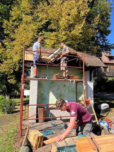 Owa wos hod sie seit da Tagwache um 06:30 Uhr ois dau? De Buam hom sie glei an Dachl Nr. 2 gmocht. Des kead nu gedeckt und Dach Nr. 3 woat a nu auf de neichen Schindln. Leider hod uns des Dachdecken von da großen Tafel mehr Zeit kost ois gedacht. De Gaupen bzw. die Ichsen woan bissl kompliziert zu decken. Außerdem mussten olle Schindln einzeln nachgeschnitten wean. Owa für de flinken Leit goa ka Thema!