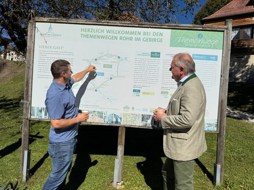 „Herzlich Willkommen bei den Themenwegen in Rohr im Gebirge“ – soboid ma in den Park einakimmt, siacht ma de große Tafel die einen herzlichst begrüßt!