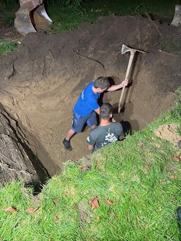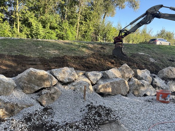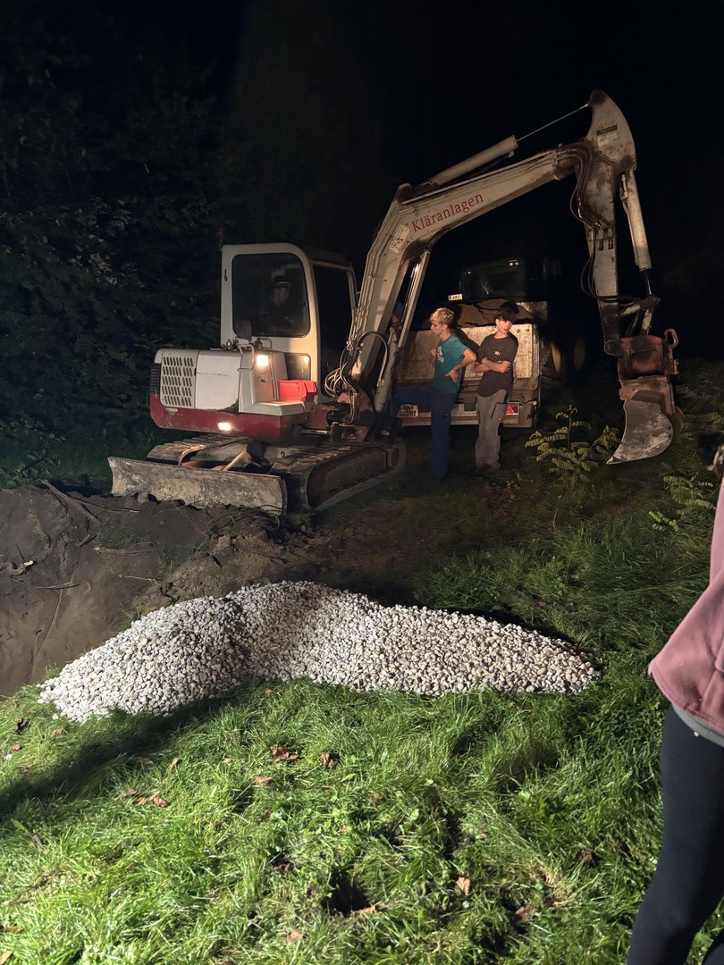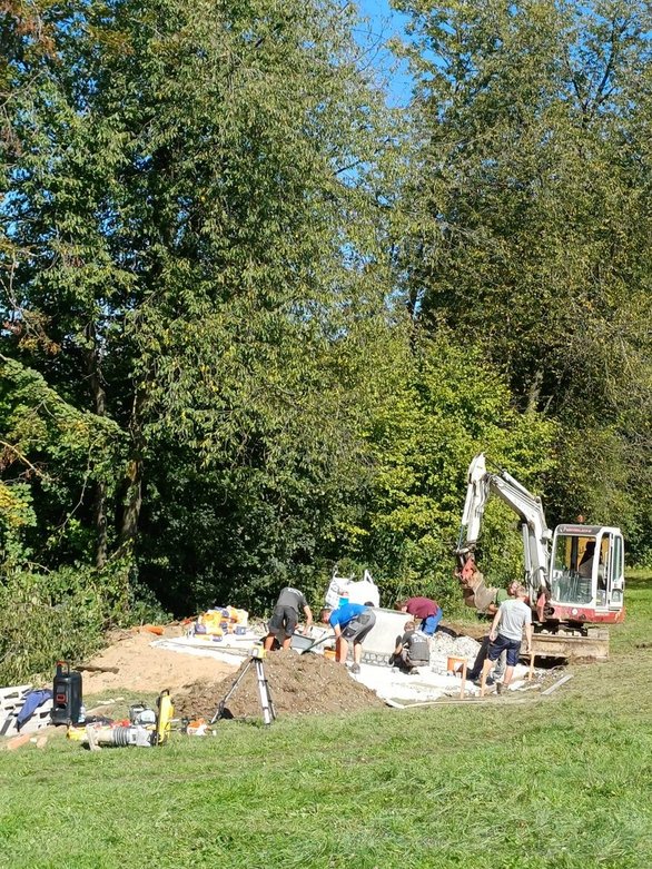 Zuerst wurde ein 2x3 m großes und 2m tiefes Loch mit dem Bagger ausgehoben. Anschließend wurden 2 Rohre verlegt und mit Betonschotter / Schotter überdeckt. Die Schallringe werden nacheinander eingesetzt und rundherum mit Erde aufgefüllt und mit der Rüttelplatte verdichtet.