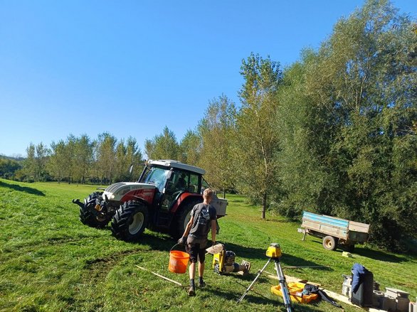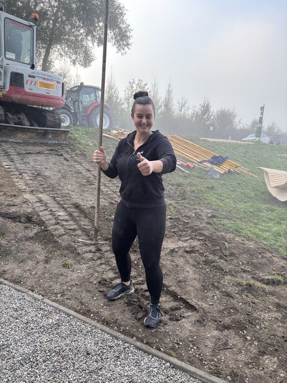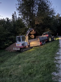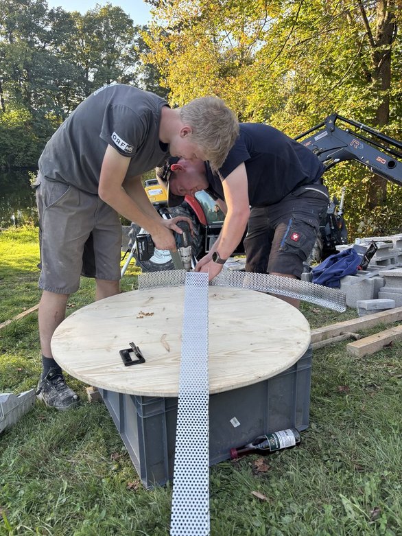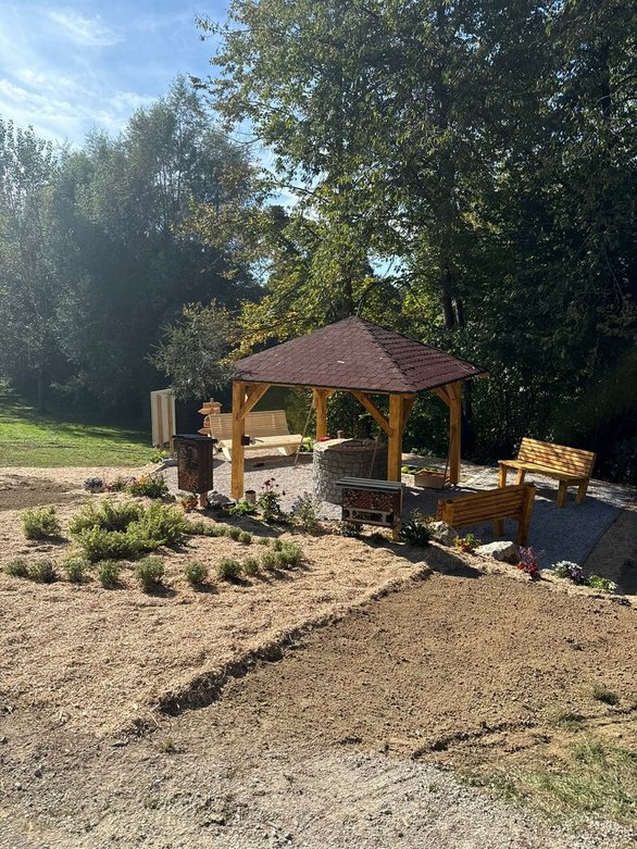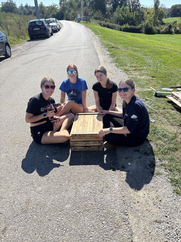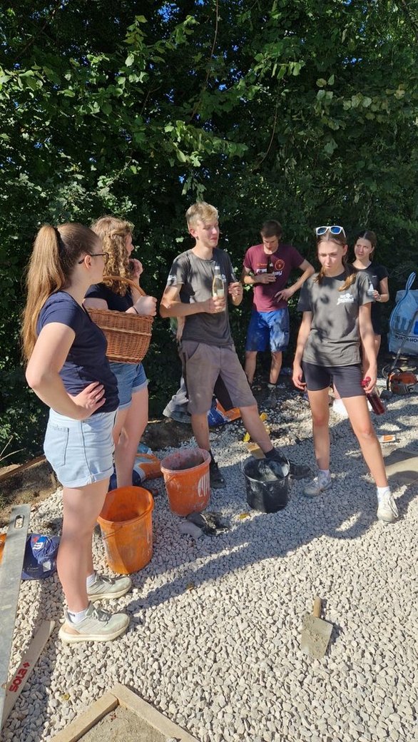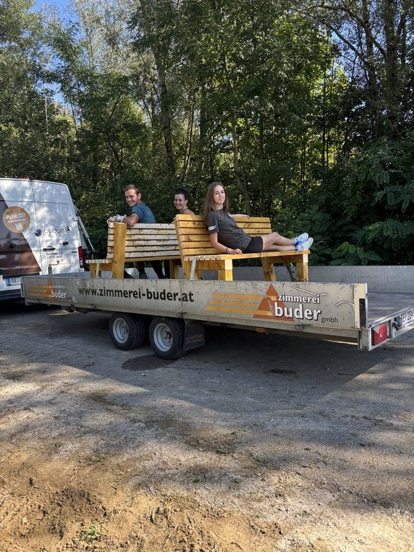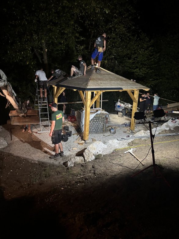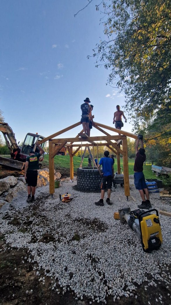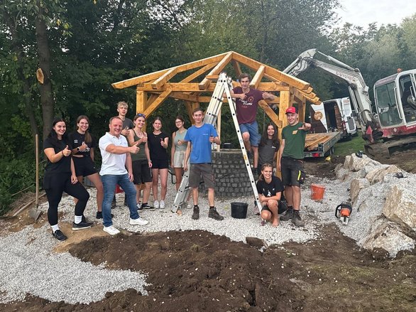 Unter dem Motto „ Der frühe Vogel fängt den Wurm“ starteten wir in die verbleibenden letzten Stunden. In der Nacht wurde das Dach fertig gedeckt. Außerdem bekamen wir eine große Lieferung an Humus, die sich bereits freut verarbeitet zu werden. Auch unser Mostbrunnen wurde von den Burschen fertiggestellt. Weiters fertigten sie im Sägewerk noch Sitzmöglichkeiten in Form von 2 Bänken.