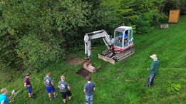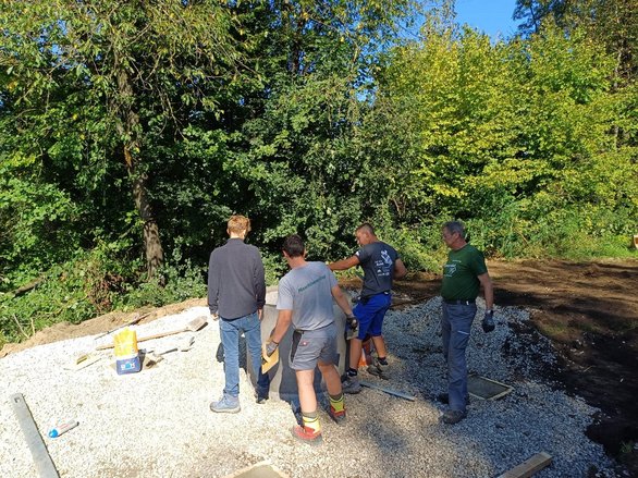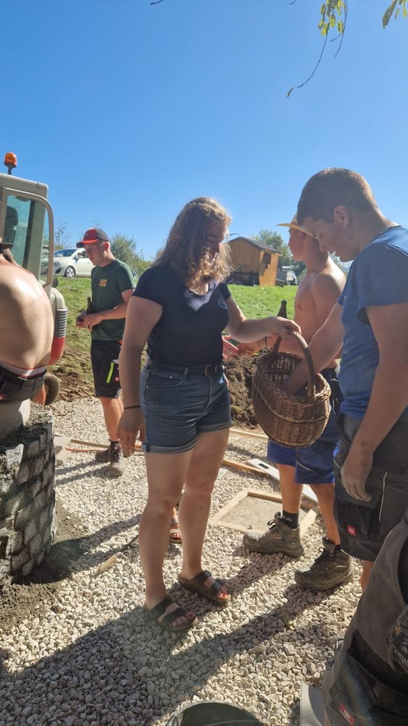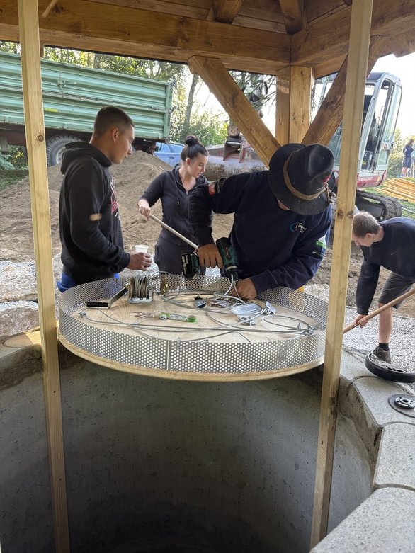 Auch unser Mostbrunnen nimmt langsam Gestalt an. Es werden fleißig, Reihe für Reihe, Pflastersteine um den Brunnenring gelegt. Außerdem ist das Fundament für unseren Pavillon bereits betoniert.