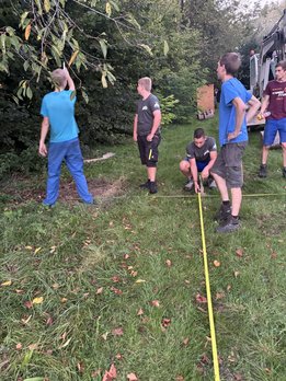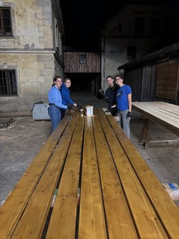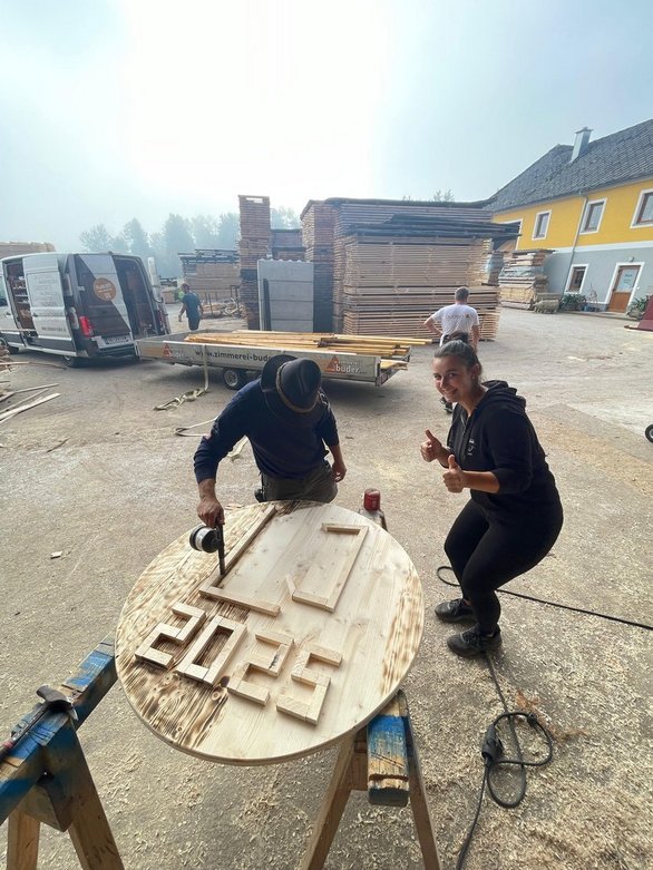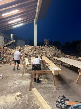 Um die Aufgabe eine Überdachung für den Mostbrunnen zu schaffen ist das Team Holz damit beschäftigt ein Pavillon zu bauen. Die Burschen starteten in der Sägerei, wo das Holz abgebunden, gehobelt, und gestrichen wird.