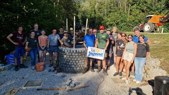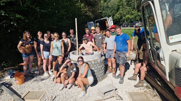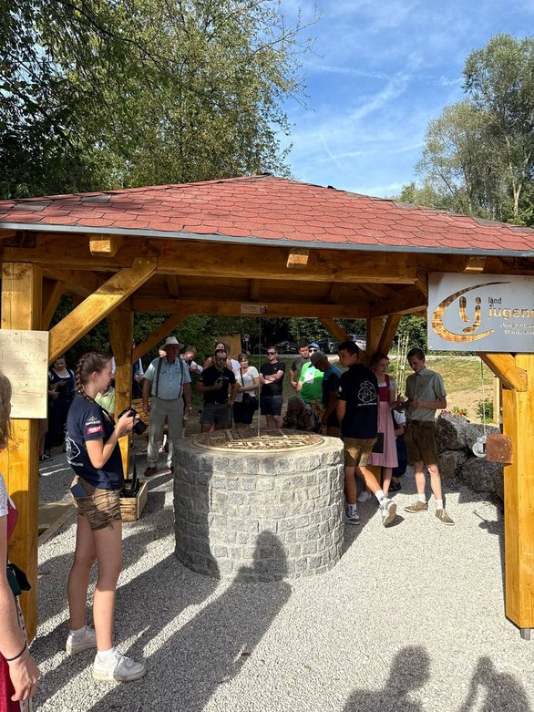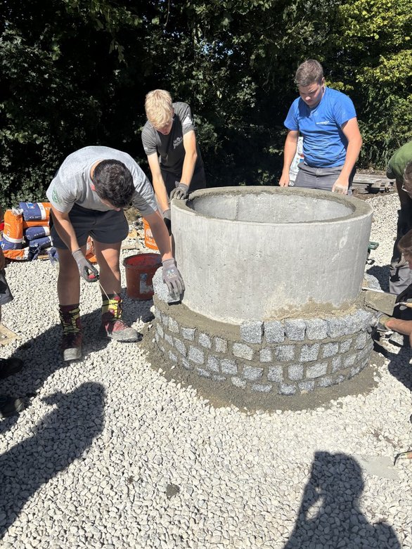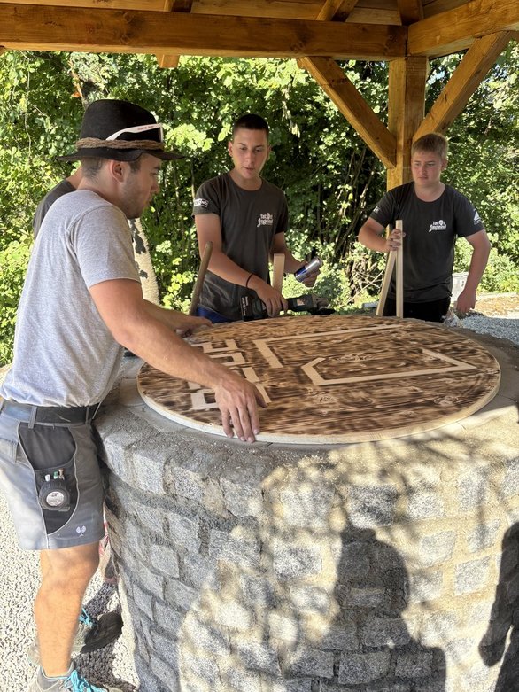 Am Nachmittag haben wir fleißig weitergearbeitet: rund um den Brunnen wurden die Pflastersteine fertig verlegt und zusätzlich eine Steinmauer errichtet. Auch der Deckel für den Mostbrunnen wurde angefertigt.