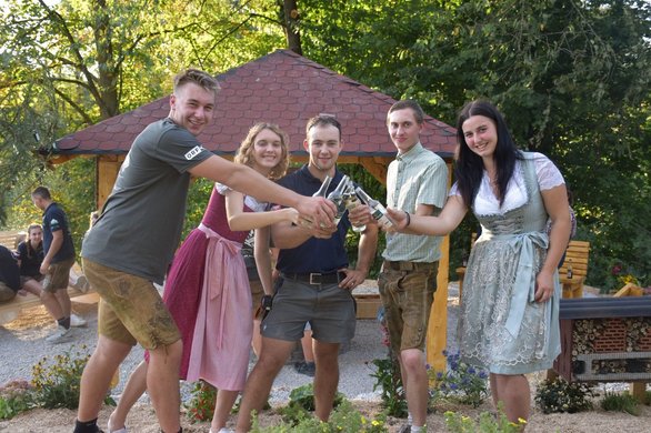 In den Abendstunden starteten wir mit der Montage unseres Mostbrunnen – Pavillon. Nachdem unsere Fundamente hart genug waren, fingen wir an die Säulen für unsere Konstruktion zu setzen. Unser vorbereitetes Holz war maß genau abgebunden und wurde zügig in die richtigen Stellungen gebracht. Nachdem der Rohbau vollendet war, konnte das Dach aufgesetzt werden. Der anschließende „Gleicherbaum“ wurde ausgiebig gefeiert.