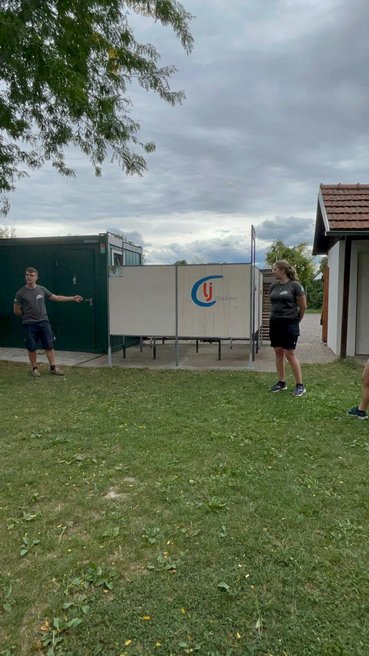 Als nun nach unsere gezwungenen Regenpause alle Materialien vorhanden sind, beenden wir den Sonnen- und Sichtschutz und befestigen unser Logo. Im Anschluss messen wir die Platten für die Umkleiden aus und schneiden sie zu, was sich als eine kleine Challenge herausstellt. Jedoch meistern unsere Mädels das ohne weitere Probleme mit Erfolg.