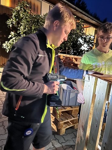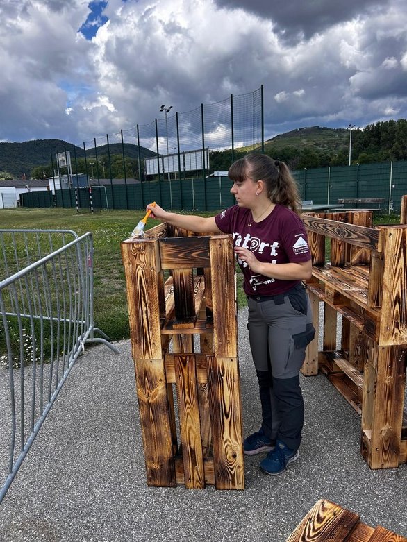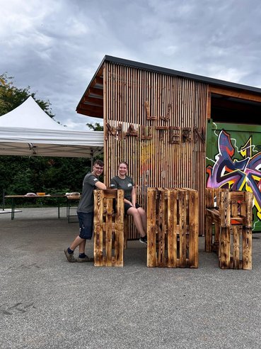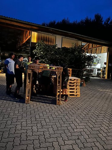 Während die Farbe trocknet bringen wir die Palettenmöbel an den richtigen Ort, die auf den Badeteich und den Jugendtreff aufgeteilt werden.
