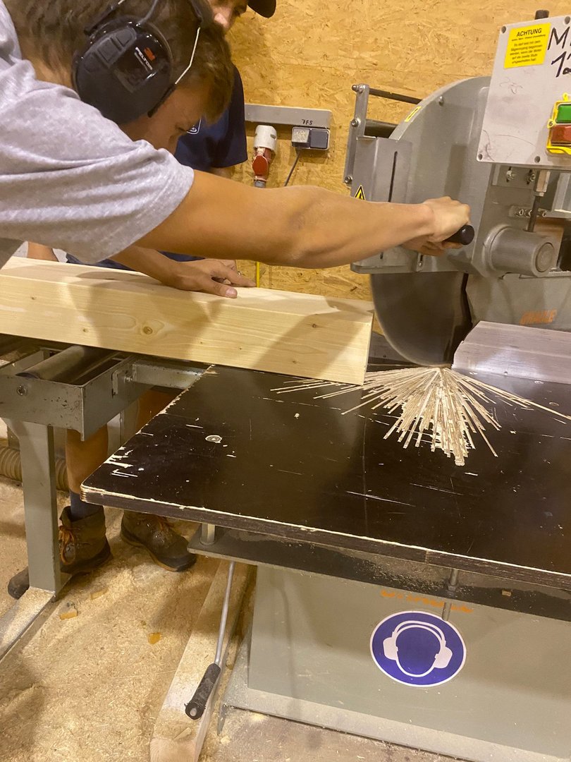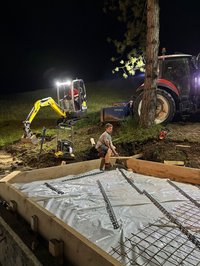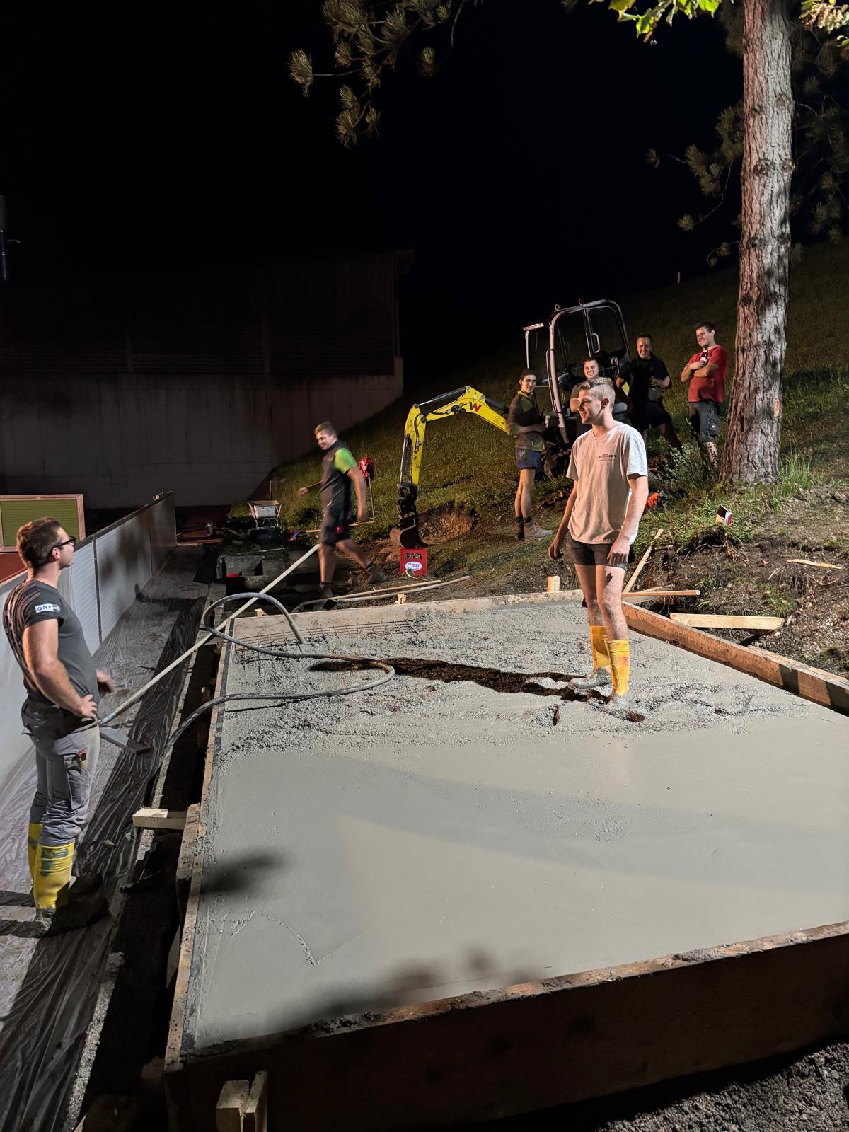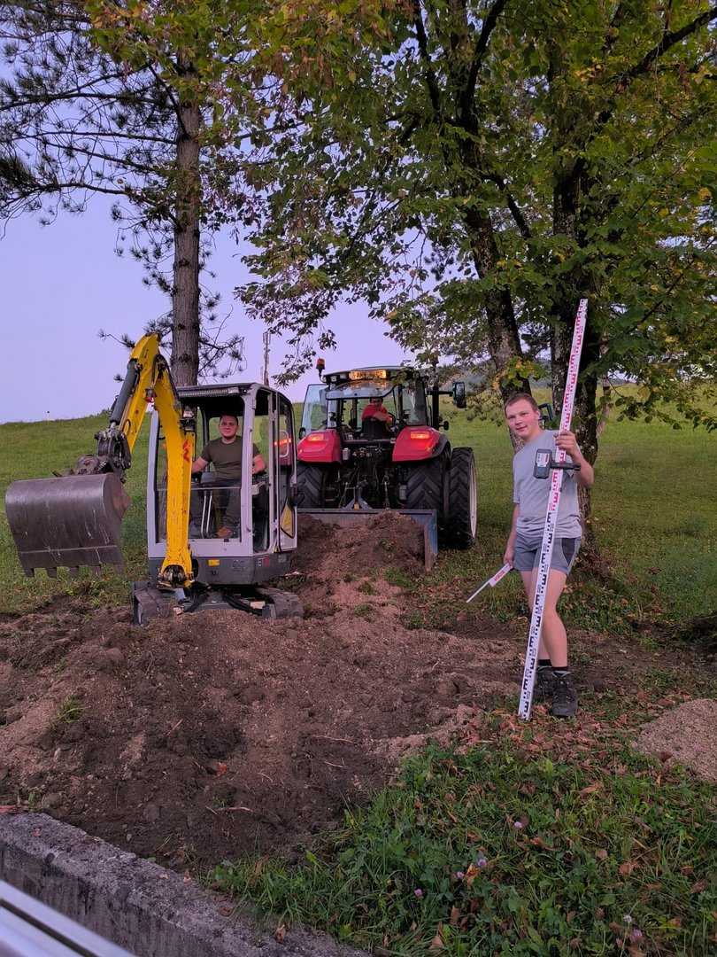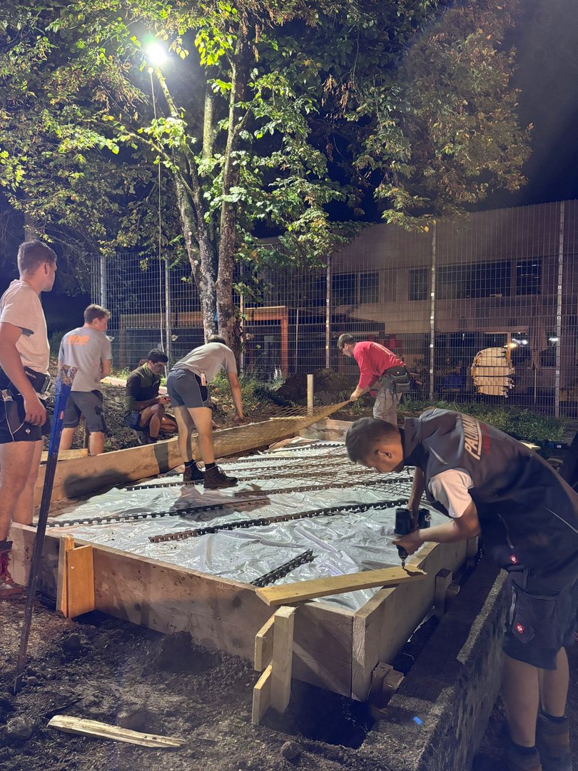 Unsere Burschen haum midn Bagger des Fundament ausgegraben und san jetzt fleißig am betonieren. Währenddessen hod unsere zweite Gruppe des Holz gehobelt und lackiert damit ma morgen mit de Aufbauarbeiten starten können.