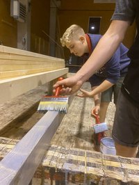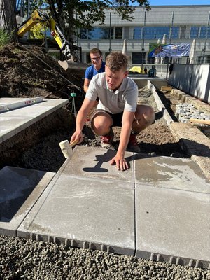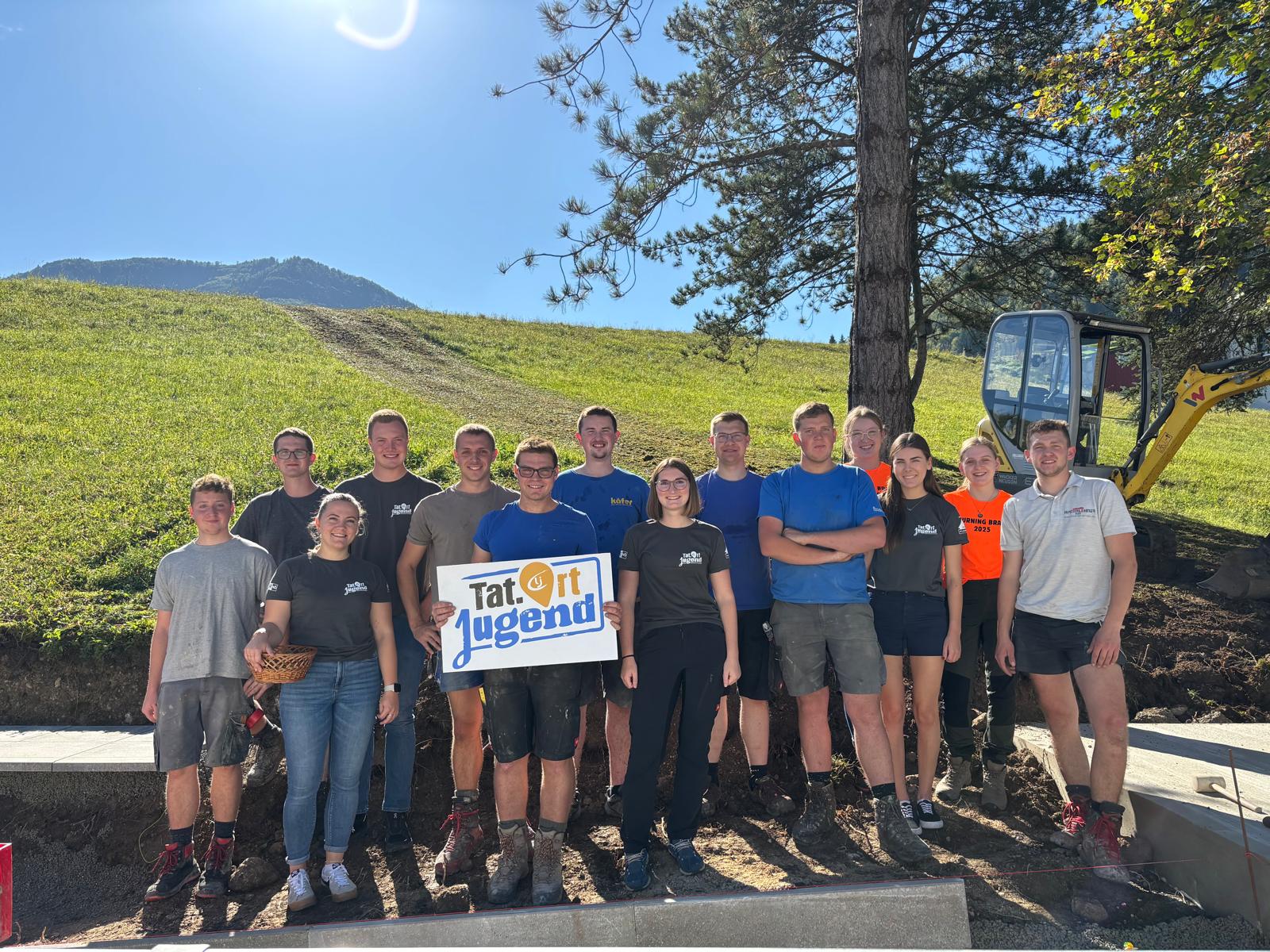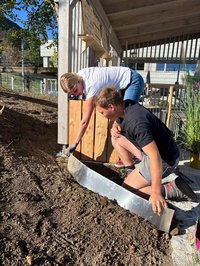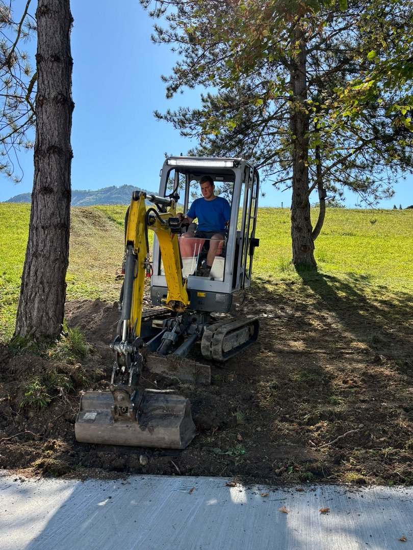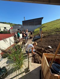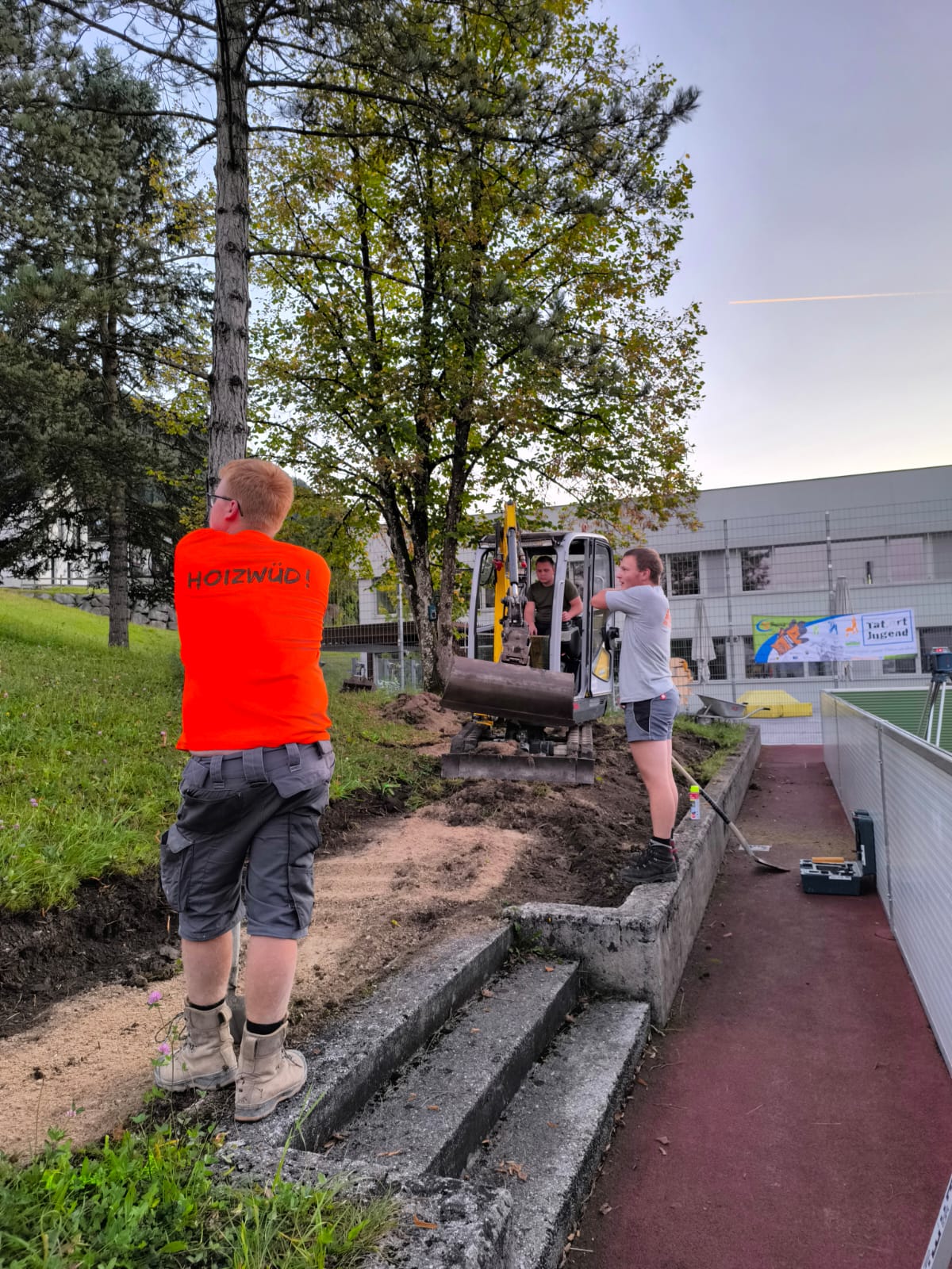Unsere Burschen haum midn Bagger des Fundament ausgegraben und san jetzt fleißig am betonieren. Währenddessen hod unsere zweite Gruppe des Holz gehobelt und lackiert damit ma morgen mit de Aufbauarbeiten starten können.