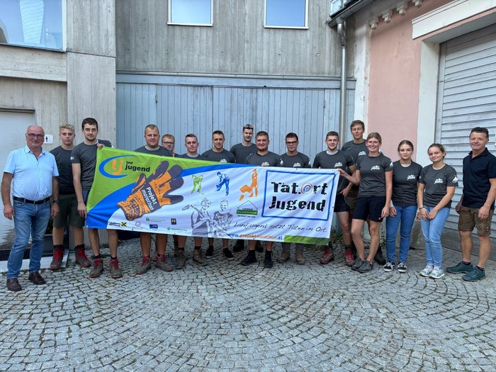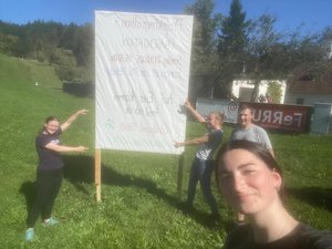 Wir woan schon richtig produktiv: Die Projektmarathon-Plakate haum ma in Ybbsitz aufgstöd, damit möglichst fü Personen davon erfahren. Außerdem basteln wir an unseren Rätseln für de Kinder und bereiten de Deko vor. Damit ma zu unserer Tribüne gelangt, san unsere Burschen dabei das an Weg pflastern.