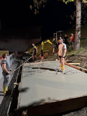 Unsere Jungs haum de Bodenplatte fertig betoniert, de kau jetzt in de letzten Nachtstunden trocknen. In der MHB - Halle hauma bis um 4 Uhr in da Früh de Bänke fertig zusammengeschrauft – für alle de in de nächsten paar Tage scho platznehmen wollen. In dera Zeit hauma bereits a de Plakate geschrieben. Seid gespannt, wos ois nächstet kimmt….