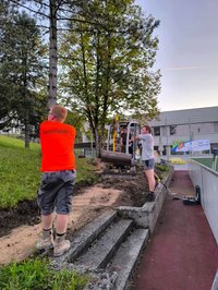 - Einen gepflasterten Weg zu unserer Tribüne legen