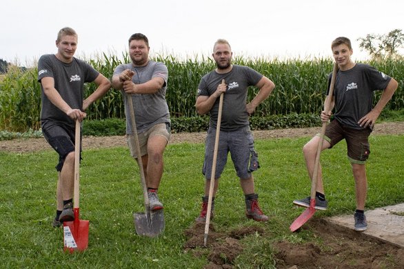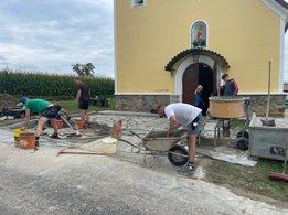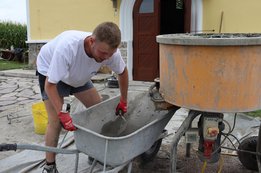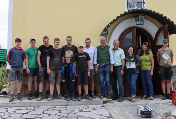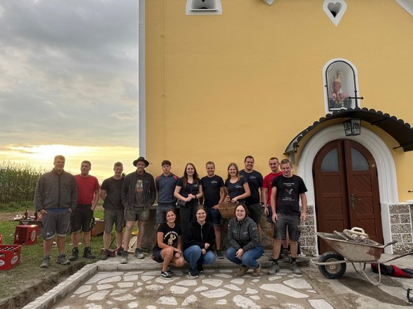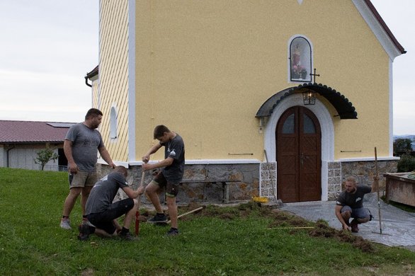 Gleichzeitig starteten in Niederaigen die Pflasterarbeiten. Gegen 11 Uhr legten die Arbeiter eine kurze Pause ein, da in der Kapelle eine Taufe stattfand – ideal, um auch die wohlverdiente Mittagspause einzulegen. Zuvor sorgten unsere Burschen noch dafür, dass der Weg zur Kapelle gesäubert und sämtliche Geräte weggeräumt wurden, sodass der Eingang zum Kirchlein frei blieb.