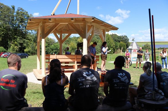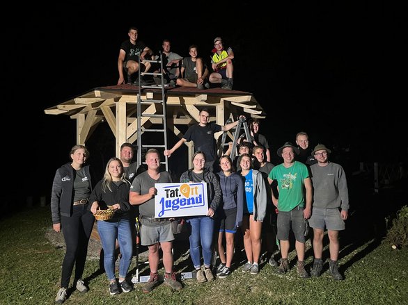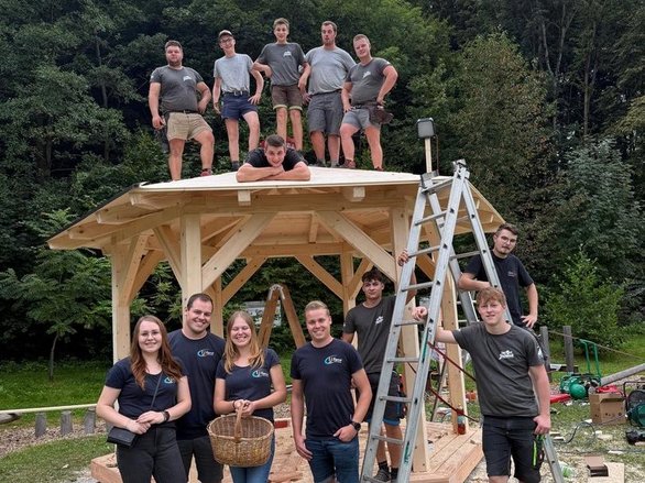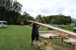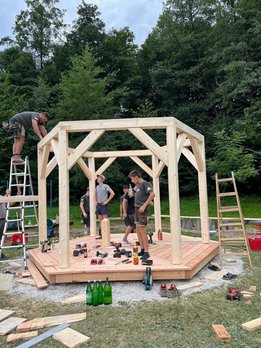 Bereits am späten Nachmittag hatten unsere Burschen das Pavillon vollständig aufgebaut. Am Abend wurden auch die selbstgebauten Bänke und der Tisch dorthin gebracht und natürlich gleich bei einer ersten Proberunde getestet.🪵
