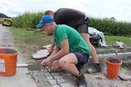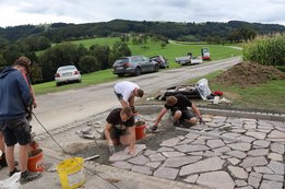 In Niederaigen bei der Kapelle ist bereits die Hälfte des Pflasters verlegt – und sogar unsere Omas Anni und Rosemarie packten tatkräftig mit an.