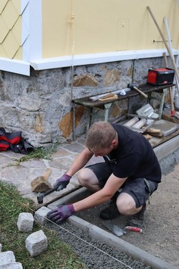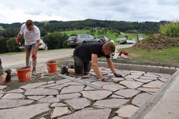 Legt das Pflaster und betoniert den Splitt.