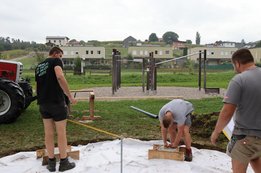 Beim Fitnessparcours in Karling werden inzwischen die ersten Steher für das Pavillon fixiert.