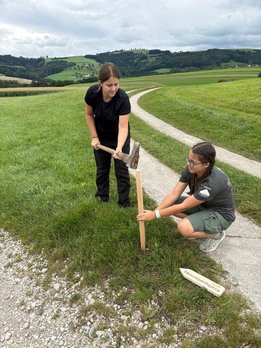 Unsere Mädls sind unterwegs, um die Wegschilder mit den Beschreibungen an den passenden Stellen aufzustellen.