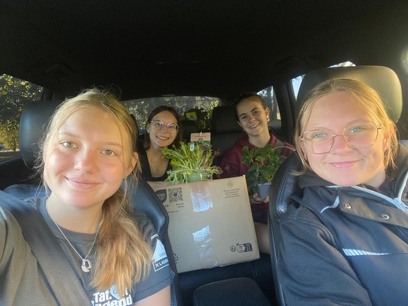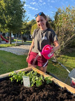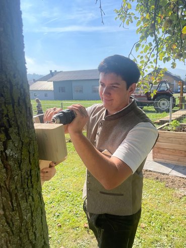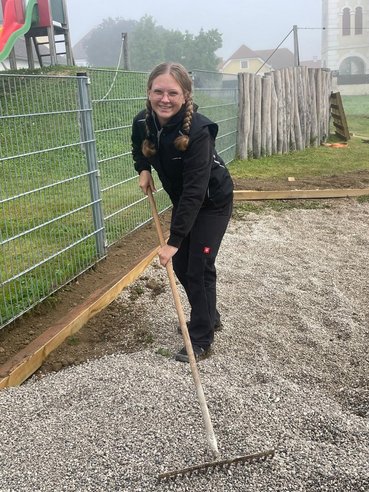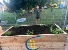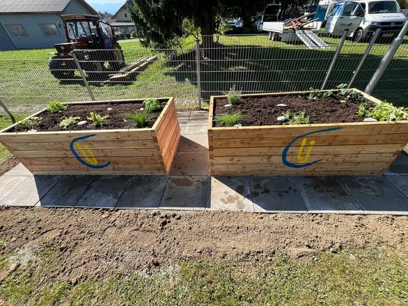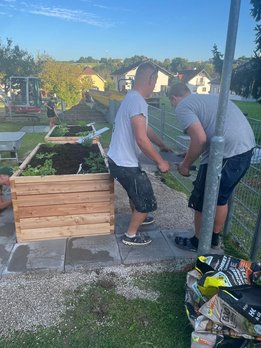 Die zusammengebauten Hochbeete stellten wir auf und rundherum wurde gepflastert. Danach befüllten wir sie mit Reisig, Dünger und Erde, wo wir anschließend viele verschiedene Kräuter, Gemüse und Beeren eingepflanzt und beschriftet haben: