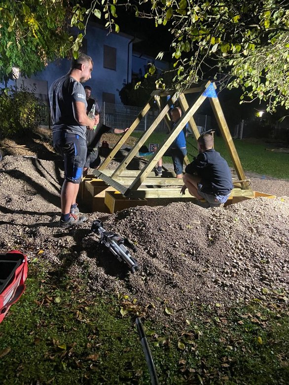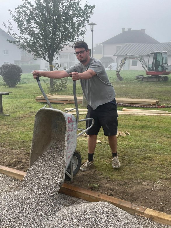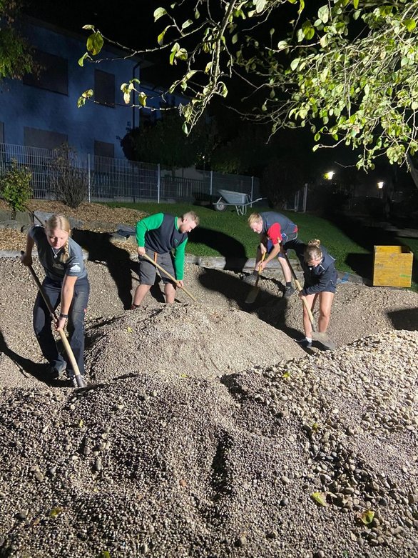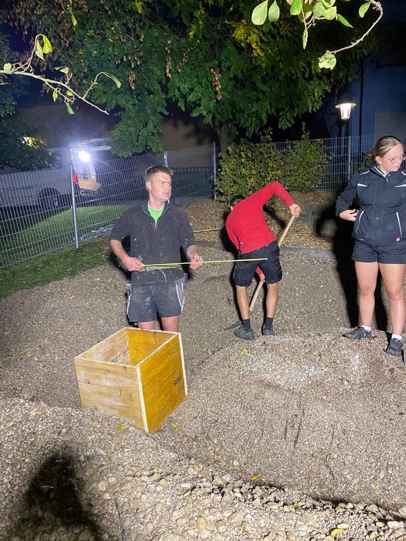 Gestern ging es mit Muskelkraft an den Untergrund des Kletter- Spielhauses, heute lösten wir die Schalung und schütteten es wieder mit Steinen zu somit ist das Grundgerüst fertig .