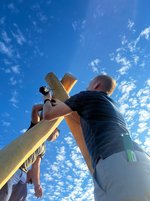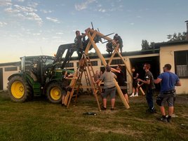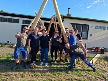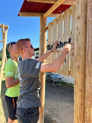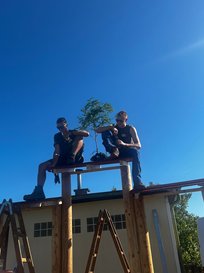 Am Nachmittag ging es mit voller Energie weiter an unserem Bahnsteig. Das Dach wurde fertiggestellt und die Bretter für die Wand befestigt. Ein großer Meilenstein, den wir mit dem Aufsetzen des Gleicherbaums feiern konnten.