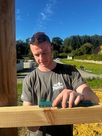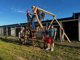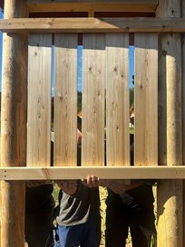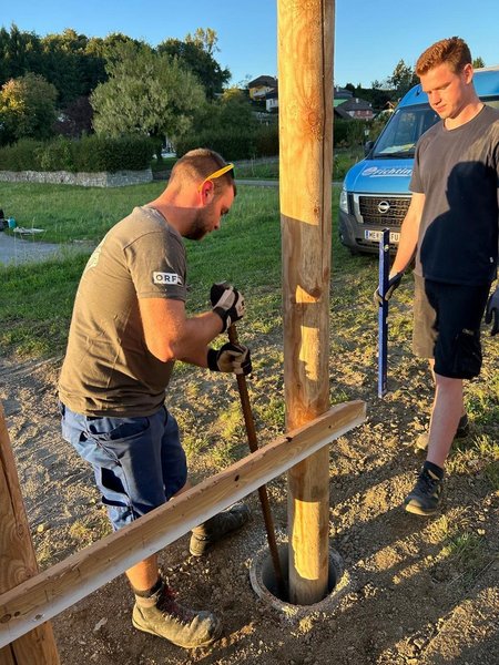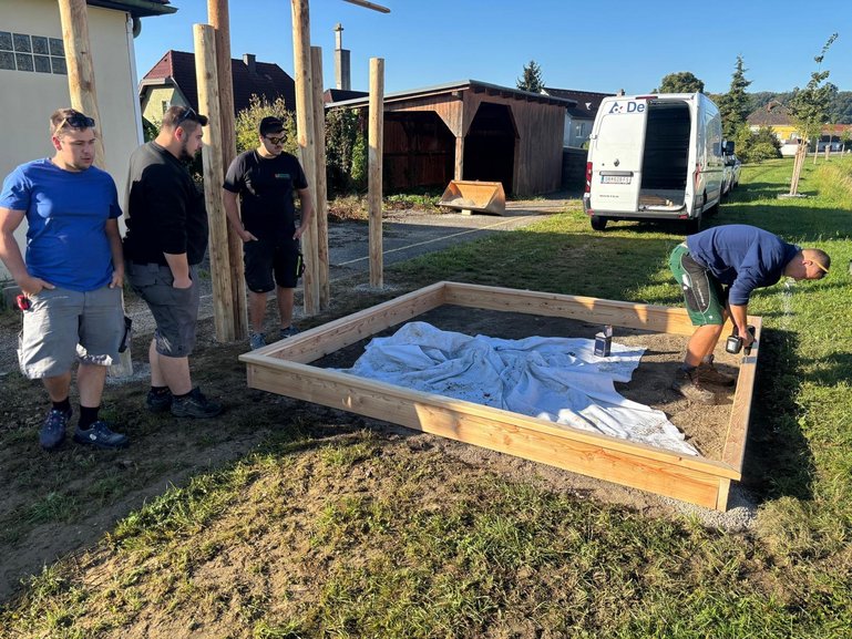 Bereits um 7 Uhr morgens versammelte sich unser Team im Bauhof Persenbeug. Mit voller Energie ging es weiter: Die Sandkiste nimmt Form an, und auch die Dachkonstruktion wird langsam erkennbar.