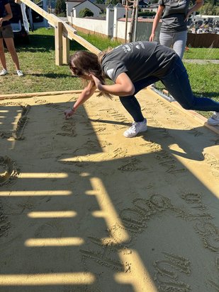 Danach stand die Fertigstellung der Sandkiste am Programm. Der frisch gelieferte Sand wurde verteilt und schön eben gerecht.