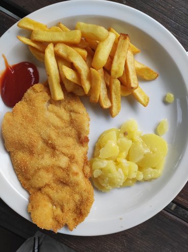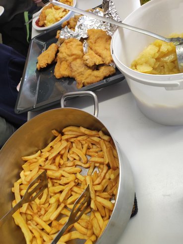 Punkt 12:00 Uhr – die Agenten beendeten ihre laufenden Missionen und sammelten sich im Hauptquartier zur gemeinsamen Stärkung. Auf dem Menüplan: knusprige Einsatz-Schnitzel, begleitet von goldenen Agenten-Fritten und klassischem Kartoffelsalat – eine Mahlzeit, die Kraft für den weiteren Einsatz versprach. Mit Präzision wurden die Teller gefüllt, und innerhalb kürzester Zeit herrschte konzentrierte Stille am Tisch – einzig das Klirren der Gläser und das leise Klacken der Messer war zu hören.