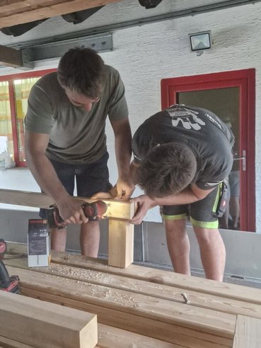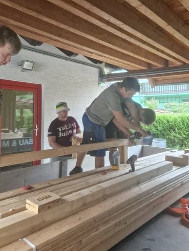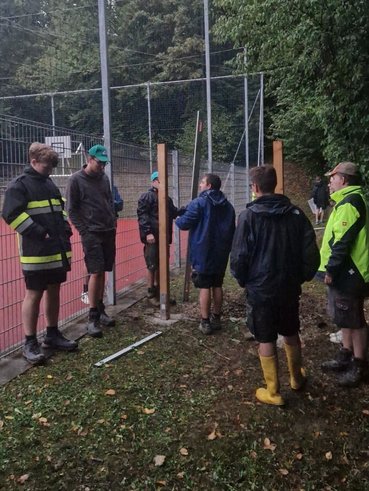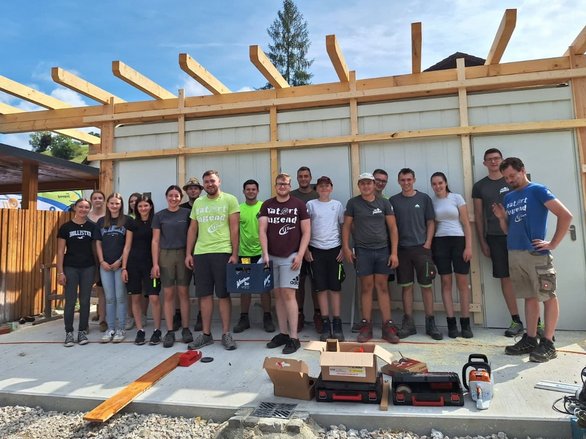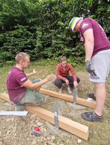 Kaum waren die ersten Holzbalken zugeschnitten und die Pfosten millimetergenau in die frisch gegossenen Fundamente gesetzt, schlug die Natur zurück: dunkle Wolken zogen auf, der Regen brach über das Einsatzgebiet herein.