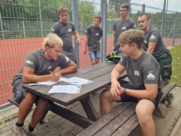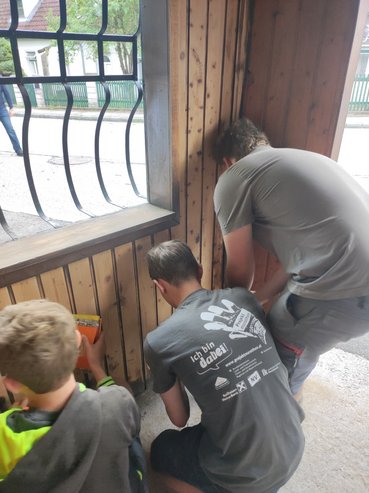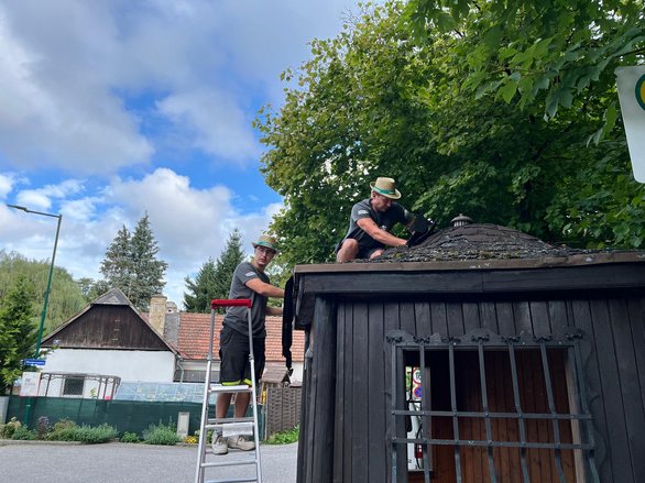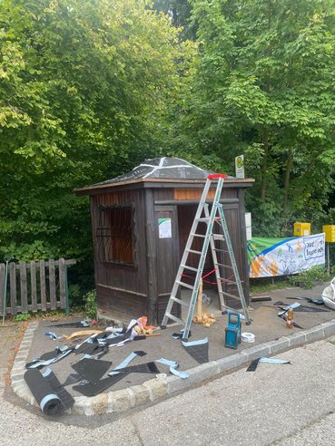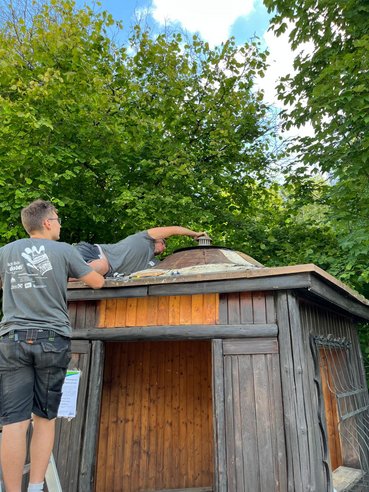Parallel dazu eröffnete Team Y am Objekt „Hütte“ die nächste Phase: die Dachdeckung. Mit Leitern, Schindeln und taktischem Fingerspitzengefühl wurde das alte Holzgebäude Schicht für Schicht gegen äußere Einflüsse verstärkt. Regen, Wind und Zeit sollen künftig keine Chance mehr haben, die Struktur zu gefährden.