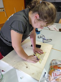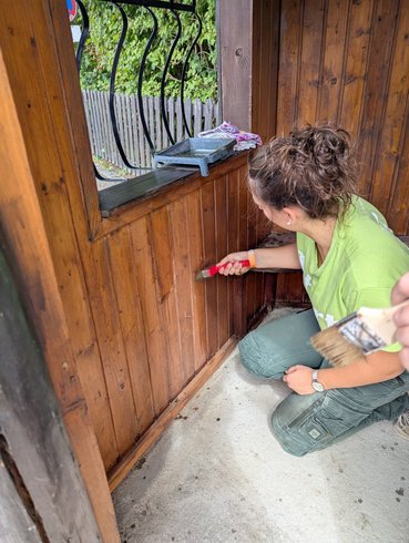 „Parallel dazu nahm sich die zweite Einheit das Objekt Hütte vor. Mit Präzision wurden alte Schichten Schicht für Schicht entfernt – wie Beweise, die sorgfältig vom Tatort gesichert werden. Jeder abgeschliffene Span brachte verborgene Strukturen ans Licht und bereitete die Grundlage für eine neue Tarnung. Sie ist nun bereit, in der nächsten Mission mit frischer Farbe neu codiert zu werden.“
