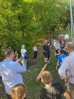 Parallel dazu standen die Agenten auf dem Sportgelände im Einsatz. Mit vereinten Kräften wurden die verbliebenen Fitnessgeräte millimetergenau ausgerichtet, verschraubt und fixiert. Unter strengem Blick der Einsatzleitung überprüften Wasserwaagen und Zollstöcke den Erfolg. Die Geräte der Agentenakademie sind damit nun offiziell einsatzbereit.