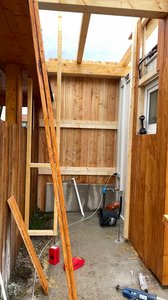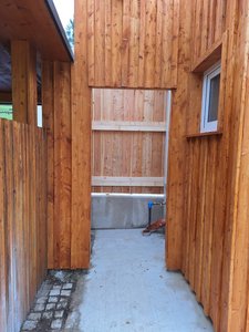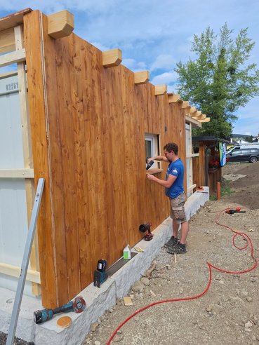 Schon langsam wird der WC-Container vollständig mit den Holzbrettern verkleidet (verschönert).