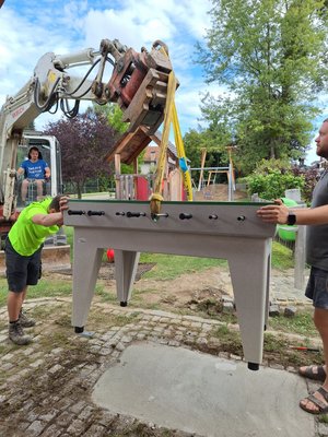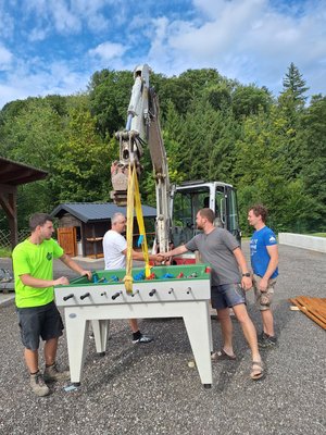 Mit Hilfe vom Bagger wurde der Wuzzl-Tisch angehoben und an seinem vorbereiteten Platzerl abgesetzt und fixiert.