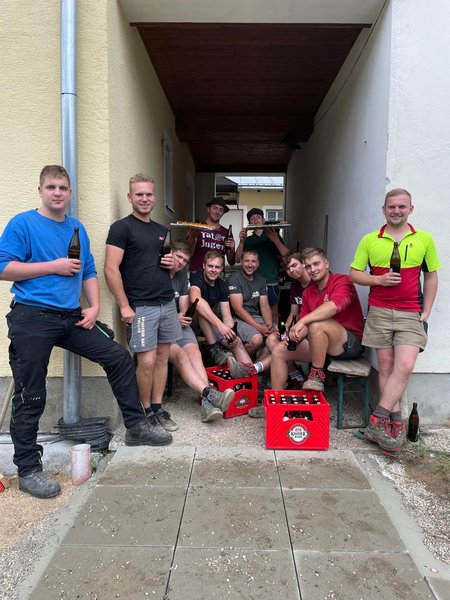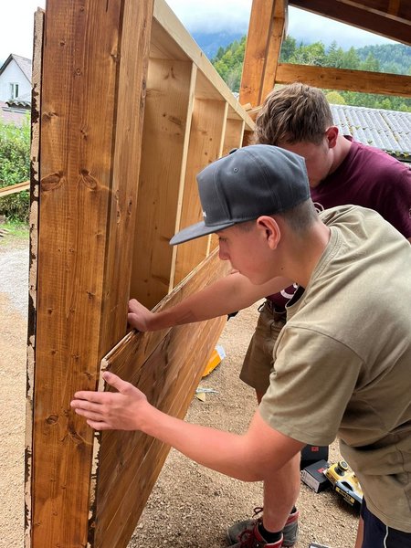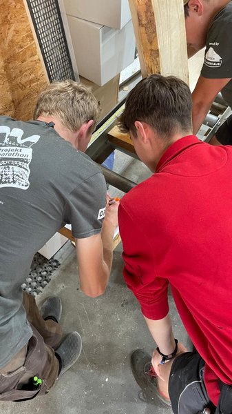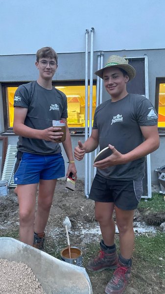 36h vor der Projektpräsentation: Beim Pfarrheim wird weiter gestrichen, geschottert und geschremmt. In der Zimmerei geht es flott voran mit der Sitzbank, die Schalung ist auch schon zugeschnitten und gestrichen. Das Medienteam überlegt sich gerade einen kreativen Projektnamen. Langsam aber sicher neigt sich der erste Projektmarathontag dem Ende zu…