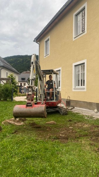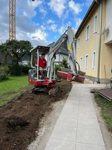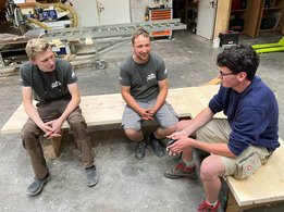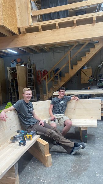 40 h vor der Projektpräsentation: Es wird bereits der Weg zum Pavillon gebaggert. Währenddessen wird die Schalung in der Zimmerei Heigl vorbereitet. Damit`s a gemütlich wird im Pavillon, machen unsere 2 Tischler eine Sitzgelegenheit.