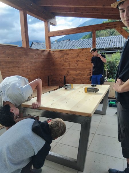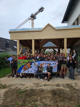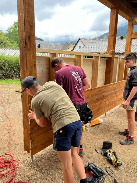 13 h vor der Projektpräsentation: In der Werkstatt ist was los. Die Blumentröge sind fertig, in die Eckbank wird gerade das LJ Logo hineingefräst und es wird mit Holzliegen begonnen. Beim Pavillon wird noch fleißig das Pflaster gelegt, gestrichen und bei der Schalung der letzte Feinschliff vorgenommen.