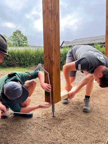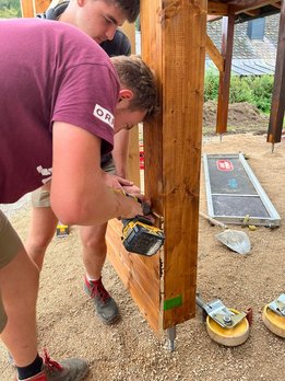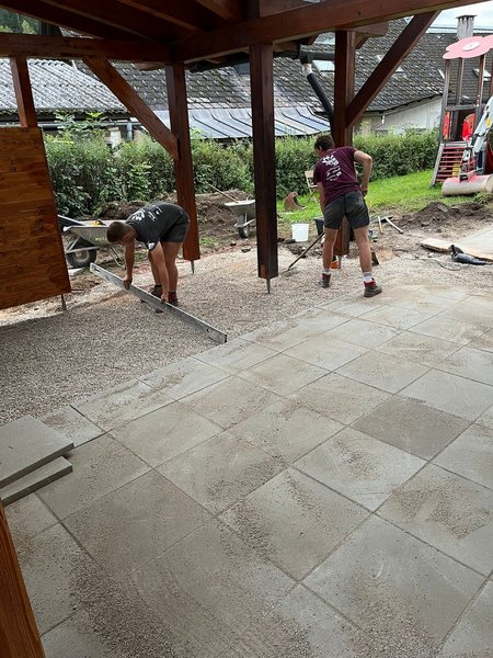 21 h bis zur Projektpräsentation: Frisch gestärkt beginnt der Samstag Nachmittag. Es ist fertig geschottert und schon kann gepflastert werden. Bei der Schalung ist auch schon einiges vorangegangen. Unsere Tischler und die Mädels sind auch am werken. Wir freuen uns auf einen erfolgreichen restlichen Tag!