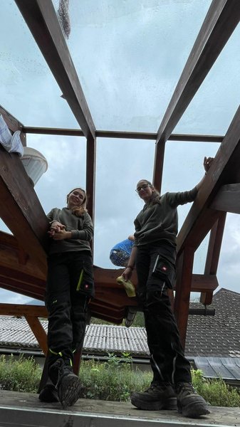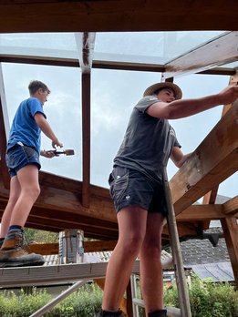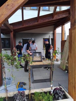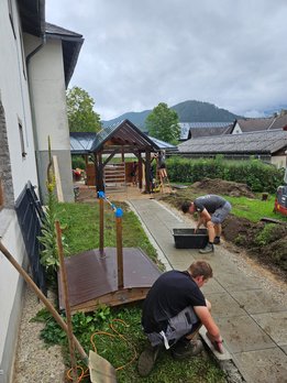 19 h bis zur Projektpräsentation: Das Projekt nimmt schon Form an. Die Mädels planen noch die Deko und die Blumentröge. Die Burschen sind fleißig am Pflaster legen, zimmern und tischlern. Auch die Fenster vom Pavillon sind wieder sauber und geputzt.