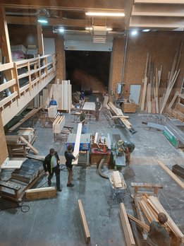 11 h vor der Projektpräsentation: Unsere Mädels haben die Nähmaschine ausgepackt. Stoff wird schon zugeschnitten für Sitzdackerl für die Eckbank. In der Werkstatt wurden die Bank, der Tisch und ein Stehtisch fertiggestellt. Die Liegen sind noch in Arbeit. Beim Pflastern ist auch ein Ende in Sicht. Wir sind zwar schon müde, lassen uns aber nicht unterkriegen.