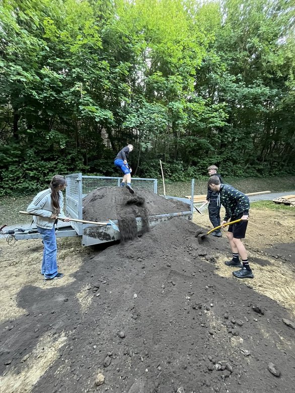 Anschließend sind wir als Gruppe mit dem Obmann der Gemeinde durch den Schlosspark gegangen. Er hat uns die veralteteten Infotafeln gezeigt. Auf einer freien Fläche haben wir die Möglichkeit einen Barfußweg, sowie Sitzgelegenheiten zu errichten. Um uns einen genauen Überblick zu erschaffen, haben wir uns die bereits vorhandenen Tafeln abfotografiert. Nachdem wir uns den veralteten Lehrpfad live angeschaut haben, haben sich einige im Konferenzsaal der Gemeinde zusammengesetzt, um die weiteren Schritte zu planen, währenddessen schon Werkzeug geholt wurde um die Arbeiten starten zu können. Die ersten Arbeiten begannen damit Erde zu holen um die freie Fläche gerade zu machen. So wurde mit einem Radlader die Erde vom Anhänger abgeladen und anschließend zur richtigen Stelle geschoben.