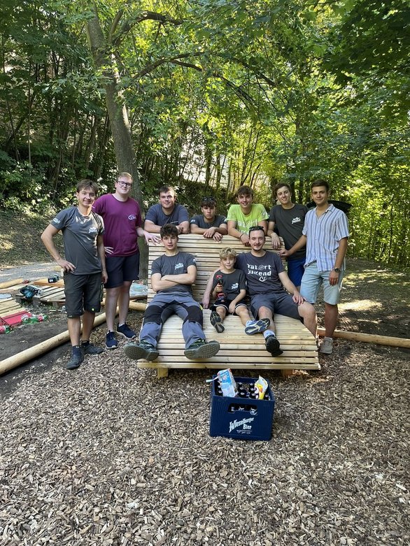 Nach einer kurzen Mittagspause ging es kräftig weiter. Der Platz auf dem die Liegen stehen sollen wurde mit Hackschnitzeln ausgelegt. Auch der Barfußpfad wurde befüllt. Weiter geht es mit dem bestätigen des TicTacToe‘S und einer nächsten Tafel. Es zeigt einen Baum der darstellen soll welche Eigenschaften ein Baum so mit sich bringt. Was nimmt er auf und was gibt er schlussendlich ab? Wir haben ihn abgeschliffen und Schilder zur Erklärung befestigt.