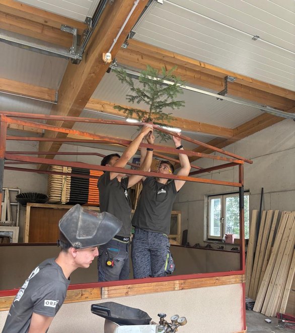 Vor der Mittagspause haben wir schließlich das Dach angeschweißt - ein wichtiger Moment, den wir traditionell mit einem Aufsetzer-Bäumchen gefeiert haben.