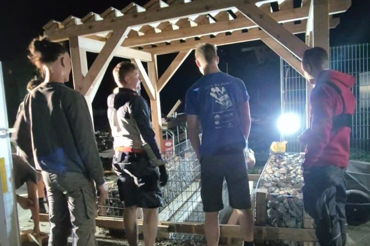 Morgenstund hat Gold im Mund – und so haben wir bereits um 8 Uhr mit den Arbeiten begonnen. Nach einem guten Frühstück und einem warmen Kaffee teilten wir uns in Gruppen auf. Der Beachvolleyballplatz wurde fertig geebnet und die Spielfeldbegrenzung aufgelegt. Einige Leute begannen mit dem Aufbau des zweiten Fußballtors, welches zu unseren Zusatzaufgaben gehört. Die Tore waren im vergangenen Jahr durch das Hochwasser zerstört worden. Einige Mädels begaben sich auf Einkaufstour, um Materialien für die Telefonzelle zu besorgen und sich um unser leibliches Wohl zu kümmern.